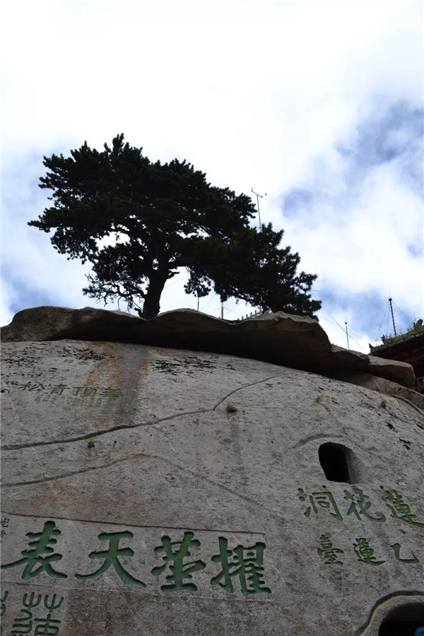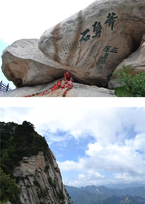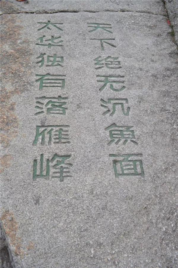在南峰頂,孩子看到“天下絕無沉魚面,太華獨(dú)有落雁峰”的題刻,打趣我:“媽媽,你叫鴻雁,這里又叫落雁峰,真是和你有緣呢!快來這塊大石頭上落落腳,歇一歇!”“好啊!咱倆都爬累了,都歇一歇!”我為孩子的體貼欣慰!