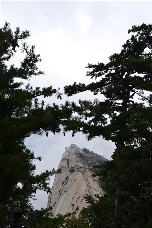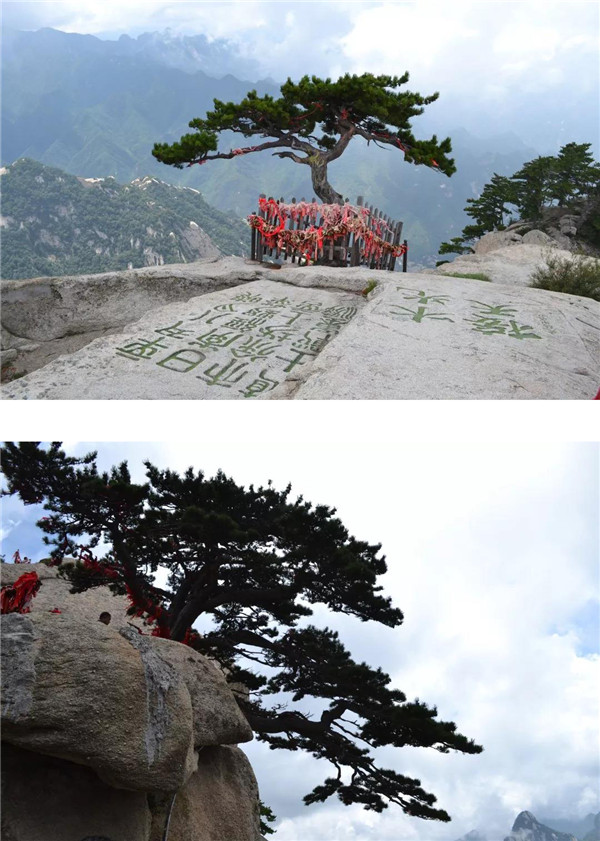 經(jīng)煉丹爐、孝子峰,云霧悄悄退隱,我們向南峰頂挺進(jìn)。南峰蒼翠秀麗,沿途的華山松千姿百態(tài),引人注目。華山迎客松生長(zhǎng)于懸崖峭壁的石縫中,向懸崖一側(cè)伸出虬勁的枝干,就像好客的秦人伸出有力的大手歡迎遠(yuǎn)道而來的客人。虬枝龍形的枝干上,是綠意盎然的松針,根根好像要刺破天穹。華山迎客松在藍(lán)天白云的映襯下,仿如碧玉雕琢而成,綠的耀眼,秀挺卓然!