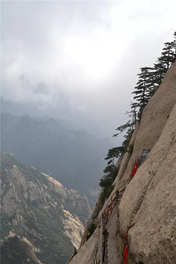 面向西峰方向,左側(cè)是斧劈般的絕壁,右側(cè)是坡度陡峭的山嶺。山脊兩側(cè)豎有結(jié)實(shí)的鐵柱,以腕粗的鐵鏈相連續(xù)。膽小的人屏住呼吸,緊抓鐵鏈前行;膽大的年輕人,不抓鐵鏈,走在中間,總讓人擔(dān)心他會(huì)滑跌!腳下的山脊有一定坡度,并不能踩平實(shí),就像走在傾斜的平衡木上。緊窄處,上山下山的人需錯(cuò)身通行。華山之險(xiǎn),讓我們刻骨銘心!