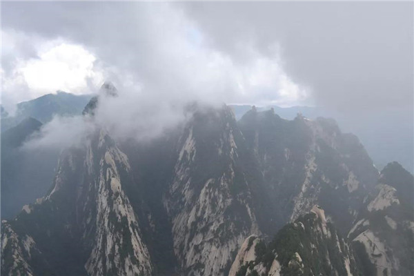 虧得我們準(zhǔn)備充分,帶有雨傘、雨衣、防雨鞋套。山頂風(fēng)狂雨暴,雨傘基本沒有遮蔽作用。即便穿著雨衣,腳蹬防雨鞋套,我和孩子也被澆成了“落湯雞”。直到坐上下行纜車,我倆才將懸著的一顆心放下。轎廂外,雨幕如瀑,雨霧籠罩了整個(gè)華山。華山尊嚴(yán)峻極、嵯峨崢嶸的一面,被雨霧遮掩了,有了朦朧秀麗的美。