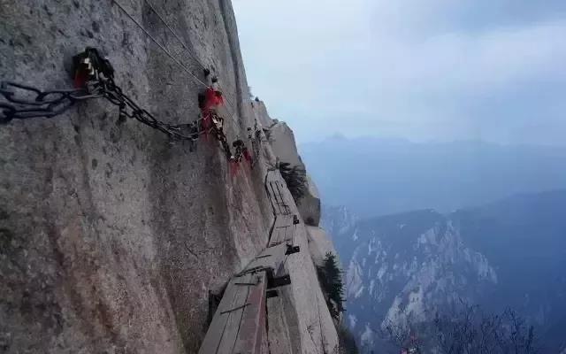 長空棧道:長空棧道位于華山南峰東側(cè)山腰,是華山派第一代宗師元代高道賀志真為遠離塵世靜修成仙,在萬仞絕壁上鑲嵌石釘搭木椽而筑。棧道上下皆是懸崖絕壁,鐵索橫懸,由條石搭成尺許路面,下由石柱固定,游人至此,面壁貼腹,屏氣挪步,被喻為“華山第一天險”。