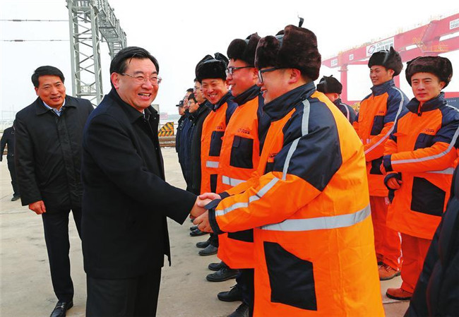 二月十一日,省委書記胡和平在西安市調(diào)研樞紐經(jīng)濟(jì)、門戶經(jīng)濟(jì)、流動(dòng)經(jīng)濟(jì)發(fā)展情況。圖為他在西安鐵路集裝箱中心站慰問春節(jié)期間堅(jiān)守一線的中歐班列長(zhǎng)安號(hào)工作人員。本報(bào)記者宋紅梅攝