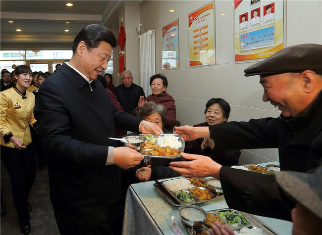 2013年2月4日,習(xí)近平來到蘭州一家“虛擬養(yǎng)老院”的養(yǎng)老餐廳,了解有關(guān)情況,還端起一個(gè)盛滿飯菜的餐盤,走到72歲的老人楊林太面前,輕輕送上,請(qǐng)他用餐。