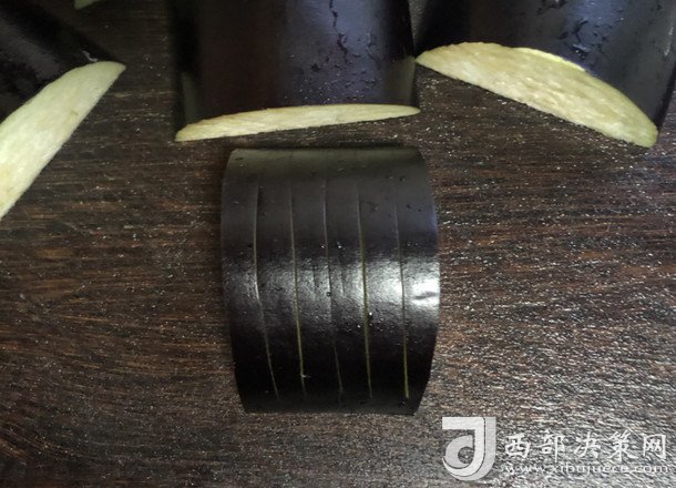 2.買(mǎi)回的大茄子洗凈,對(duì)半切開(kāi),取一半茄子先切6刀,前5刀不要切斷,第6刀切斷即可