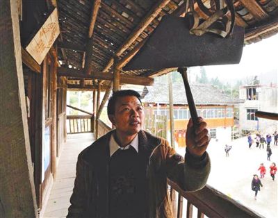 代課教師潘平忠在孖堯教學(xué)點(diǎn)教學(xué)樓二樓敲簡易制作的上課鈴。
