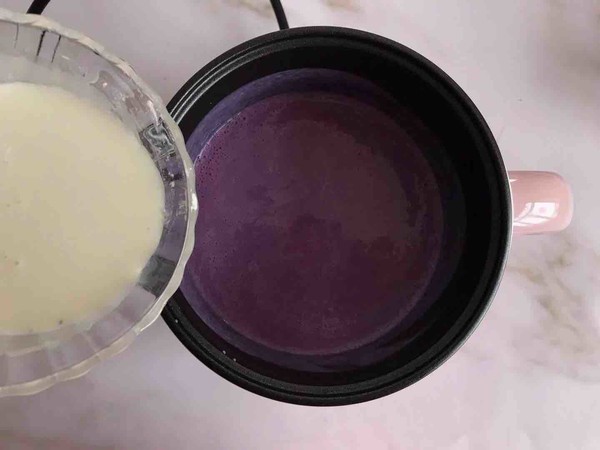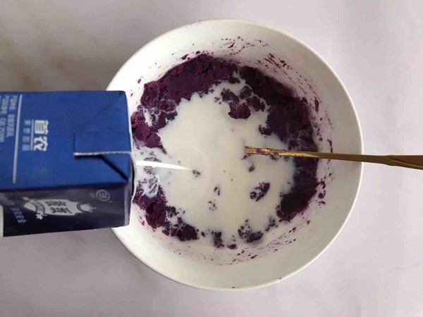 4.將剩余牛奶倒入紫薯泥中拌勻