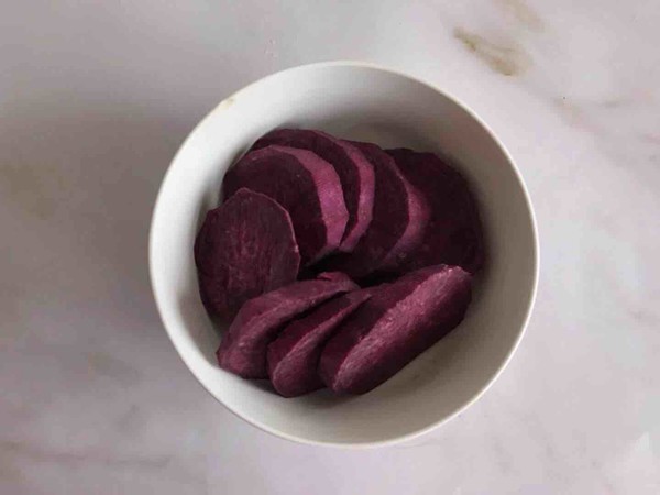 1.紫薯去皮切片,上鍋蒸熟,約20分鐘