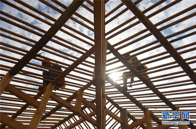 在湖北省宣恩縣曉關侗族鄉(xiāng),工人在建設吊腳樓(2018年7月26日攝)。2018年,當?shù)卣_始修建6座新的侗寨吊腳樓,為符合易地搬遷政策的貧困戶實施搬遷。新華社發(fā)(王俊 攝)