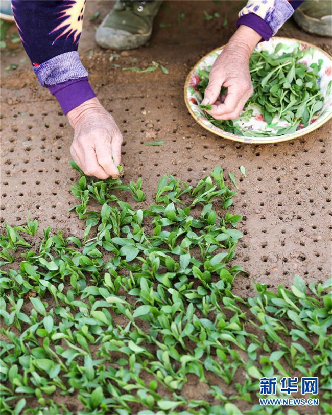 3月11日,在明光市管店鎮(zhèn)甜葉菊育苗扶貧基地,農戶在扦插甜葉菊苗。 新華社記者 曹力 攝