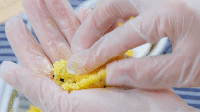 8.小米餅內(nèi)放入一個(gè)紅薯?xiàng)l,將其包裹起來(lái),收口。