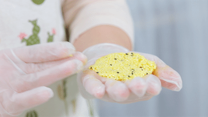 5.準(zhǔn)備好的小米飯內(nèi),加入一個(gè)蛋黃、和少量黑芝麻。