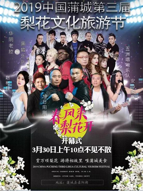 內容:“春風來 梨花開”2019中國蒲城梨花文化旅游節(jié)開幕式盛大文藝演出與您相約,陣容強大、星光熠熠唱響蒲城大地。