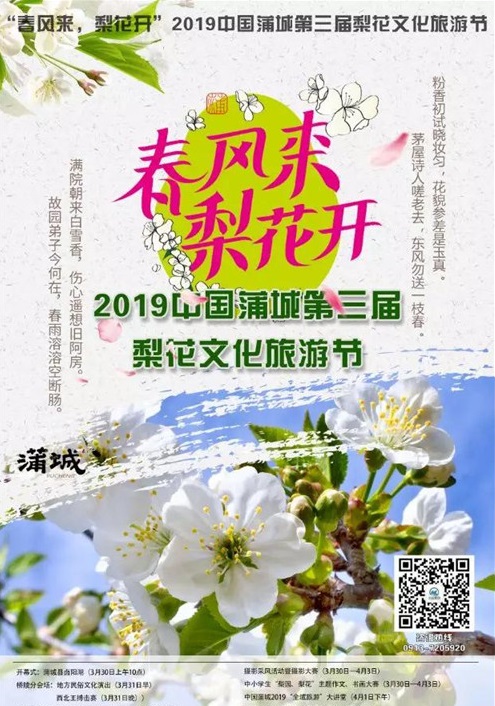 蒲城是國家農業(yè)部命名的“中國酥梨之鄉(xiāng)”,是國內外專家公認的"世界優(yōu)等酥梨最佳生態(tài)區(qū)"。本次活動以“梨花”為媒介,通過系列文化體驗活動的舉辦,讓蒲城文化走出去,以帶動區(qū)域旅游經濟的發(fā)展。本屆梨花文化旅游節(jié)由陜西華山旅游集團蒲城有限公司、蒲城縣旅游建設投資有限公司主辦,蒲城縣委宣傳部、政府辦、文化和旅游局、公安局、農業(yè)農村局、果業(yè)局、交通局、商務局、應急管理局、市場監(jiān)督管理局、教育局、信訪局、電力局、交警大隊、電視臺、體育中心、孫鎮(zhèn)政府、橋陵鎮(zhèn)政府、陳莊鎮(zhèn)政府、椿林鎮(zhèn)政府、橋陵景區(qū)、清代考院博物館、惠陵景區(qū)、楊虎城將軍紀念館等單位協辦, 以“賞萬頃梨花 游將相故里 咥蒲城美味”為主題,3月30至4月3日在陜西蒲城縣舉行。