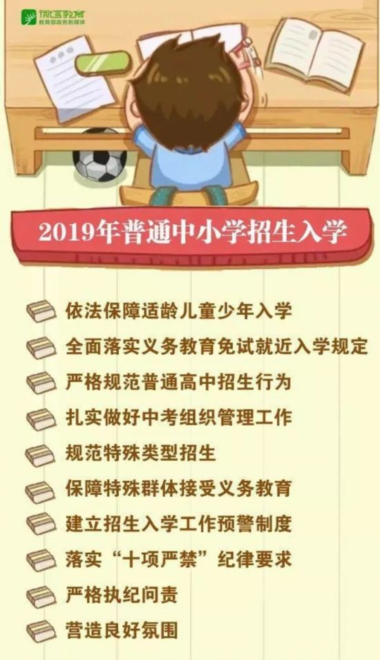 教育部辦公廳印發(fā)《關(guān)于做好2019年普通中小學(xué)招生入學(xué)工作的通知》?!锻ㄖ诽岢鲆婪ūU线m齡兒童少年入學(xué)、全面落實(shí)義務(wù)教育免試就近入學(xué)規(guī)定、嚴(yán)格規(guī)范普通高中招生行為、建立招生入學(xué)工作預(yù)警制度、嚴(yán)格執(zhí)紀(jì)問責(zé)等要求。