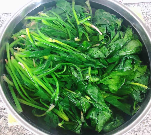 2.鍋中燒開水放入菠菜焯水至菠菜剛剛變色即可時(shí)間不可過(guò)長(zhǎng)