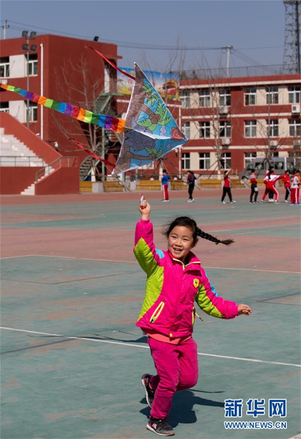 4月3日,山東臨沂市郯城縣郯城街道十里小學(xué)的學(xué)生在校園放飛風(fēng)箏。 新華社發(fā)(張春雷 攝)