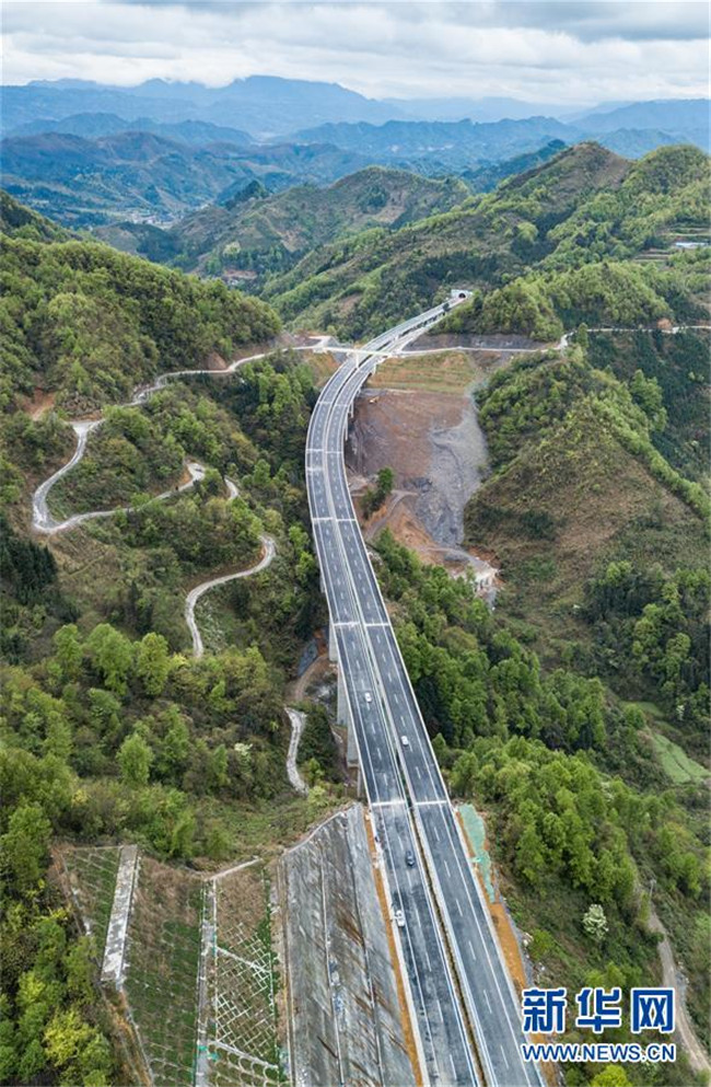 4月3日無(wú)人機(jī)拍攝的三荔高速水各至荔波東路段。 新華社記者 陶亮 攝