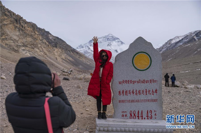標有“海拔8844.43米”的珠峰高程測量紀念碑已被移至絨布寺一帶,游客可前往合影。湖南游客唐鳳明告訴記者:“從這里觀賞珠峰非常壯觀,超乎想象。”