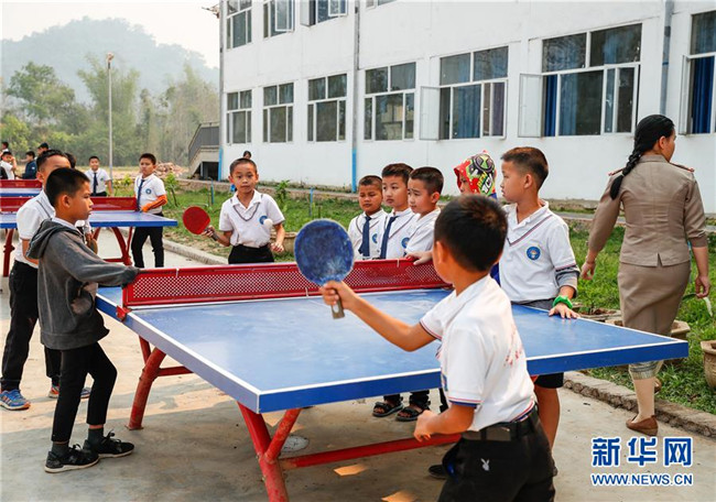 3月22日,在老撾孟賽的中老友誼學(xué)校,學(xué)生在課間休息時(shí)打乒乓球。新華社記者 王婧嬙 攝