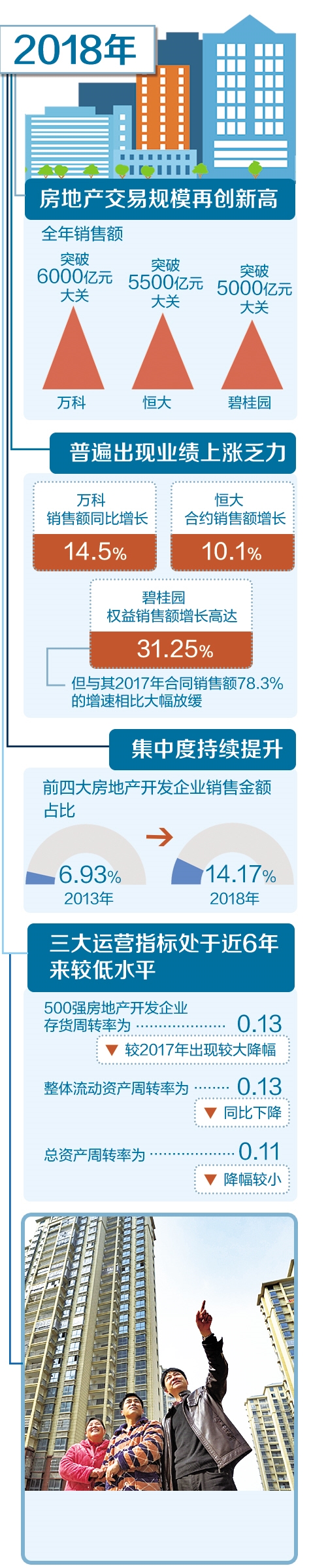 2018年,房地產(chǎn)交易規(guī)模再創(chuàng)新高,萬科、恒大、碧桂園全年銷售額紛紛突破6000億元、5500億元、5000億元大關(guān)。但在調(diào)控政策從緊的環(huán)境下,房企普遍出現(xiàn)業(yè)績上漲乏力現(xiàn)象。年報顯示,2018年萬科銷售額同比增長14.5%,恒大合約銷售額增長10.1%,增速同比均有所放緩。雖然2018年碧桂園權(quán)益銷售額增長高達(dá)31.25%,但與其2017年合同銷售額78.3%的增速相比亦大幅放緩。