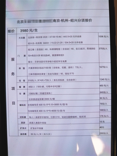 學(xué)生家長(zhǎng)提供的北京某中學(xué)初一年級(jí)南方研學(xué)游報(bào)價(jià)明細(xì)。記者 黃哲程 攝