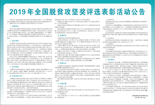 經(jīng)黨中央、國務(wù)院批準(zhǔn),國務(wù)院扶貧開發(fā)領(lǐng)導(dǎo)小組在“十三五”期間每年開展全國脫貧攻堅獎評選活動,表彰為脫貧攻堅作出突出貢獻(xiàn)的組織和個人。現(xiàn)就開展2019年全國脫貧攻堅獎評選表彰工作公告如下。