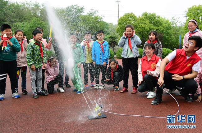 4月23日,江蘇省鎮(zhèn)江市官塘橋中心小學(xué)的學(xué)生在志愿者的帶領(lǐng)下體驗水火箭發(fā)射。新華社發(fā)(石玉成 攝)