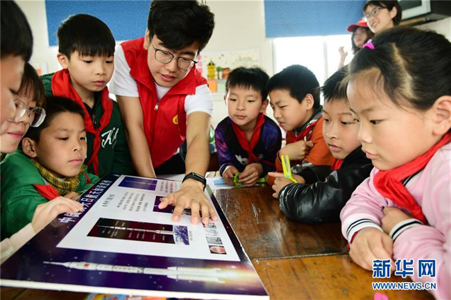 4月23日,江蘇省鎮(zhèn)江市官塘橋中心小學(xué)的學(xué)生們在志愿者的帶領(lǐng)下學(xué)習(xí)航天知識。新華社發(fā)(石玉成 攝)