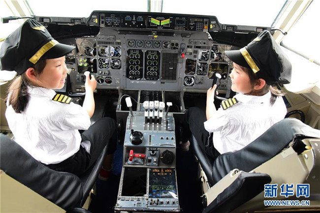 4月23日,浙江省建德市壽昌第二小學(xué)的學(xué)生在航空小鎮(zhèn)科普展示廳內(nèi)體驗?zāi)M駕駛飛機。新華社發(fā)(寧文武 攝)