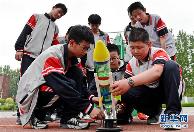 4月24日,河北省廊坊市第十三中學學生在安裝調試水火箭。當日是中國航天日,河北省廊坊市第十三中學舉辦航天主題活動,通過讓學生了解水火箭發(fā)射原理,體驗水火箭發(fā)射過程,激發(fā)學生科學探索精神。 新華社記者 王曉 攝