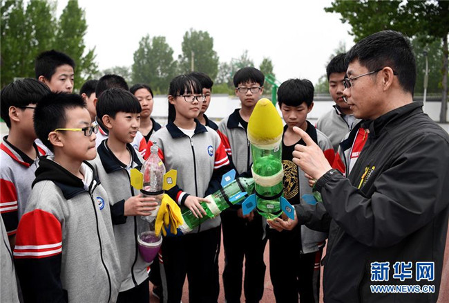 4月24日,河北省廊坊市第十三中學教師(右一)給學生講解水火箭發(fā)射原理。當日是中國航天日,河北省廊坊市第十三中學舉辦航天主題活動,通過讓學生了解水火箭發(fā)射原理,體驗水火箭發(fā)射過程,激發(fā)學生科學探索精神。 新華社記者 王曉 攝