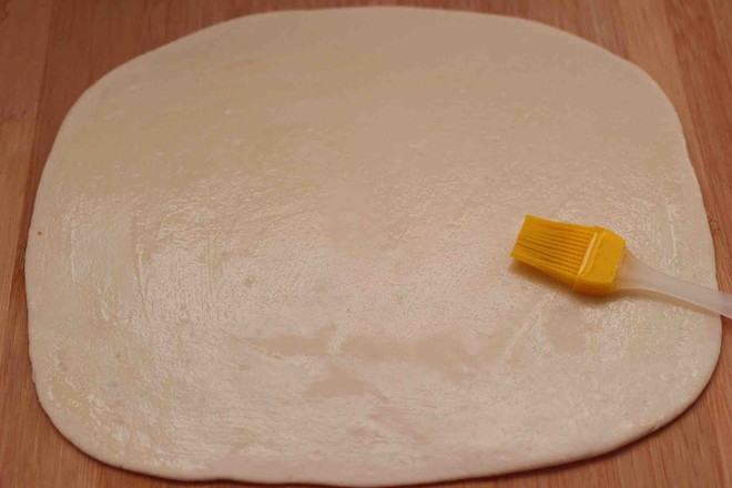 8.搟面杖搟成一塊盡量大的長方形面片。 硅膠刷子蘸上花生油,均勻地涂抹在面皮上。