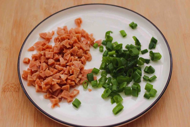 1.準備好小香蔥,把小香蔥用刀切碎,最好只用蔥綠部分,顏值高喲,把火腿腸去皮后用刀切成小碎丁。