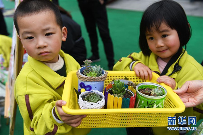 4月28日,孩子們在展示用廢舊罐子等作花盆的小盆栽。 新華社記者 徐昱 攝