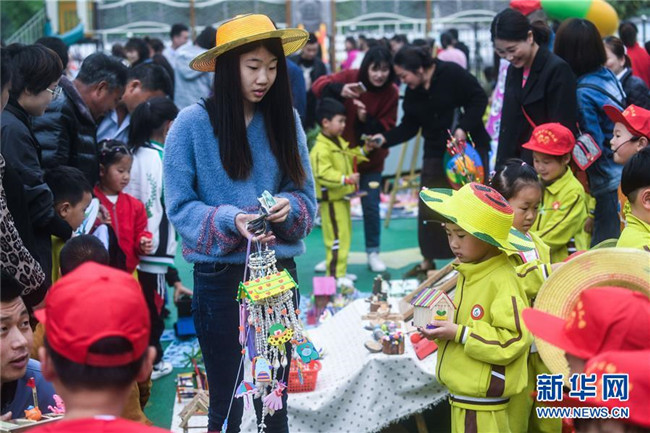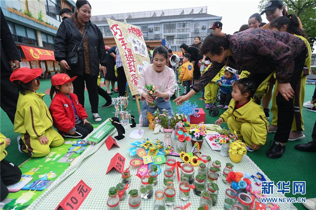 當日,浙江省長興縣畫溪街道包橋中心幼兒園舉辦校園義賣節(jié)。10多個攤位上擺放著家長和孩子一起用廢舊的玻璃瓶、雪糕棍、紙盒、紐扣等廢舊材料制作而成的小木屋、迷你小盆栽、紐扣花束、風車等手工作品,孩子們以班級為單位進行手工作品義賣,所得款項將全部用于社區(qū)公益環(huán)?;顒?。主辦方介紹,希望通過這樣的活動,倡導廢物利用和綠色低碳的生活理念。