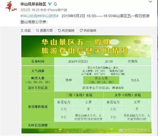 在五一小長假期間游客朋友們還可以通過關(guān)注@華山風(fēng)景名勝區(qū)新浪微博或者通過景區(qū)LED電子大屏準(zhǔn)確知曉各個時間段的登山人數(shù),以便合理調(diào)整自己的游覽計劃。