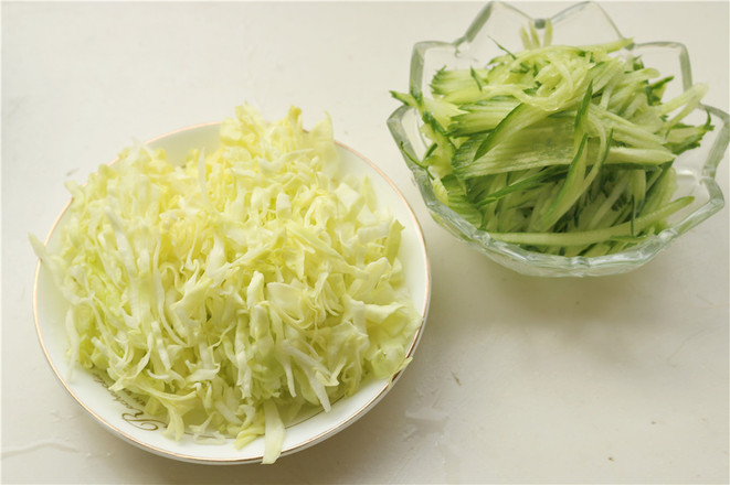 2.把配菜處理一下,黃瓜切成細(xì)絲,如果刀工不好,可以借助于擦絲器,圓白菜去掉中間的莖,切成細(xì)絲。圓白菜絲用開水燙一下,再過一下涼水待用。