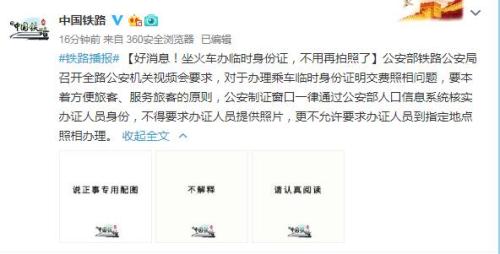 據(jù)中國(guó)鐵路總公司官方微博消息,公安部鐵路公安局召開(kāi)全路公安機(jī)關(guān)視頻會(huì)要求,對(duì)于辦理乘車臨時(shí)身份證明交費(fèi)照相問(wèn)題,要本著方便旅客、服務(wù)旅客的原則,公安制證窗口一律通過(guò)公安部人口信息系統(tǒng)核實(shí)辦證人員身份,不得要求辦證人員提供照片,更不允許要求辦證人員到指定地點(diǎn)照相辦理。