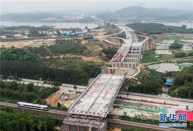 4月2日,由廣東省交通集團投資建設(shè)、中鐵四局承建的汕(頭)湛(江)高速公路北江特大橋跨京廣鐵路、國道G240轉(zhuǎn)體橋成功轉(zhuǎn)體,這是轉(zhuǎn)體橋轉(zhuǎn)體后的位置(無人機拍攝)。 新華社記者 劉大偉 攝