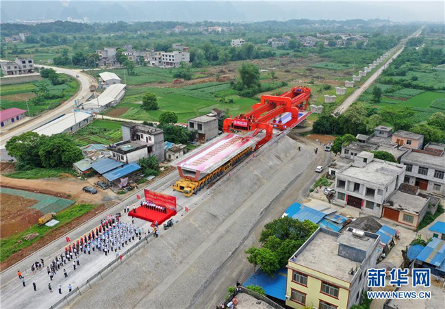 在廣西都安瑤族自治縣貴南高鐵澄江雙線特大橋施工現(xiàn)場,工人在架設(shè)大橋首榀箱梁(4月29日無人機拍攝)。 新華社記者 陸波岸 攝