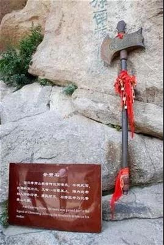 華山西峰就是《寶蓮燈》中沉香劈山救出三圣母的地方。翠云宮旁有一名為“斧劈石”的巨石,中間裂開,如同被斧劈開,旁邊還立著一柄長把大斧。據(jù)說是當年沉香救母使用的神兵。
