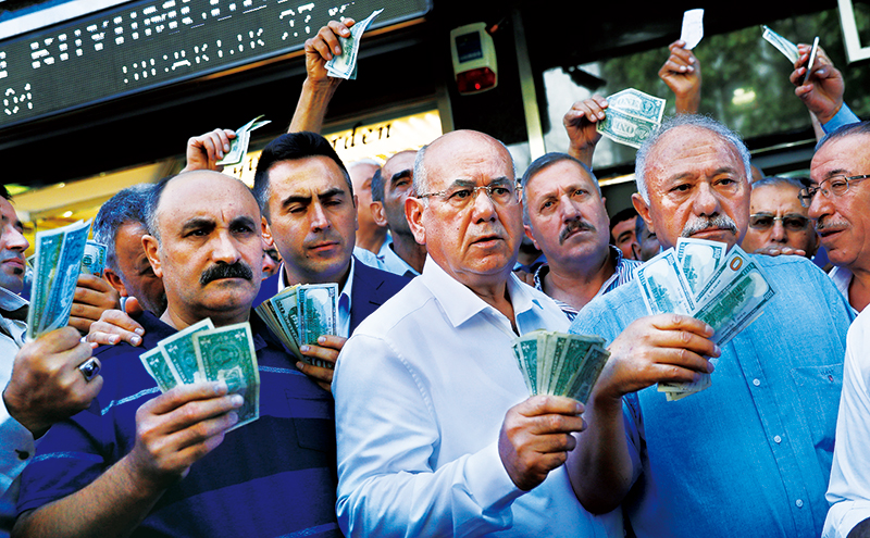 2018年,由于美聯(lián)儲加息導(dǎo)致國際游資大規(guī)?;亓?,美國對土耳其、伊朗進(jìn)行制裁以及貿(mào)易保護(hù)主義的影響,俄羅斯、阿根廷、土耳其、南非等不少經(jīng)濟(jì)體貨幣遭遇大幅貶值。圖為2018年8月14日,在土耳其首都安卡拉,人們響應(yīng)政府號召,手持美元站在貨幣兌換處前,出售手中的美元支持本國貨幣里拉。 新華社/路透