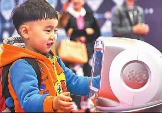 首屆新疆智能產(chǎn)業(yè)博覽會(huì)上,小朋友在與一款智能機(jī)器人互動(dòng)。新華社發(fā)
