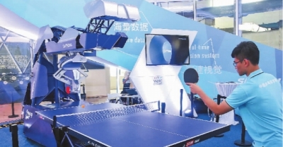 工作人員在2018世界人工智能大會(huì)現(xiàn)場(chǎng)演示與機(jī)器人打乒乓球。新華社發(fā)
