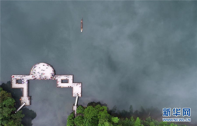 5月25日清晨,一艘小船劃過小東江江面,吸引游人駐足(無人機拍攝)。新華社發(fā)(朱孝榮 攝)