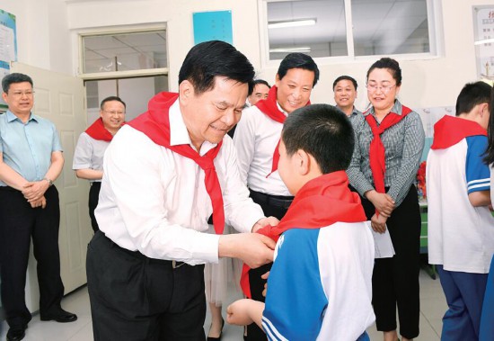 李紀(jì)恒來(lái)到一年級(jí)二班,“愛祖國(guó)、擔(dān)大任,爭(zhēng)做新時(shí)代好隊(duì)員”主題隊(duì)日活動(dòng)正在舉行,一名少先隊(duì)員走上前來(lái),為他戴上鮮艷的紅領(lǐng)巾。李紀(jì)恒說(shuō),看到小朋友們快樂(lè)活潑、朝氣蓬勃,我很高興,“六一”國(guó)際兒童節(jié)快到了,我提前祝大家和全區(qū)的小朋友們節(jié)日快樂(lè)、學(xué)習(xí)進(jìn)步、健康成長(zhǎng)。