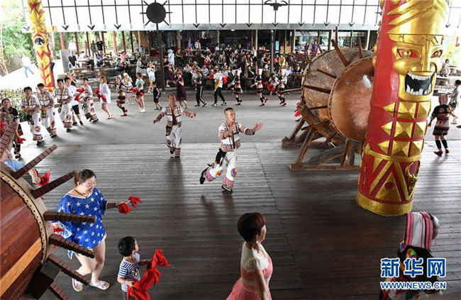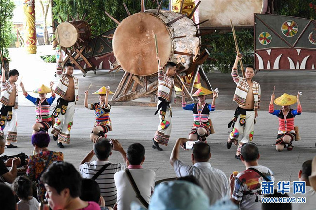 基諾族演員在表演大鼓舞(6月1日攝)。
