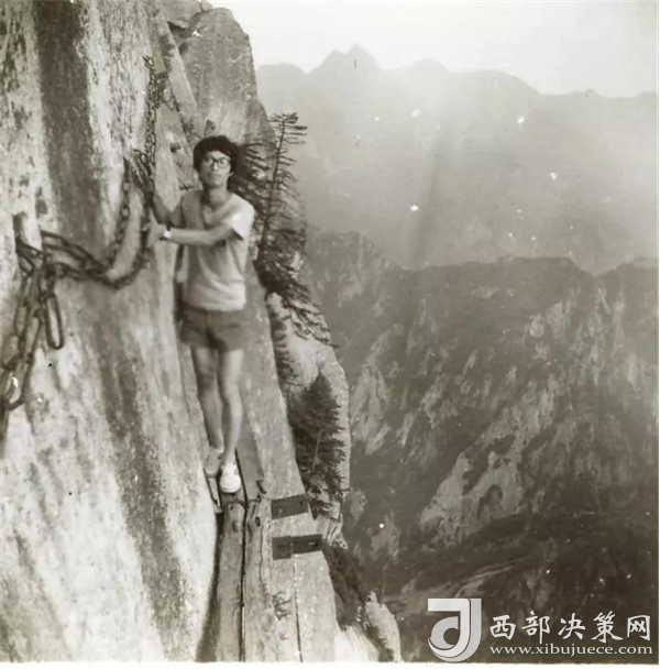 我照相的時候,一只手抓鐵鏈,一只手做動作,身體是緊貼石壁。難得的是當年一起去的一個女生給我照相,在我對面一樣危險,但女俠單手抓鐵鏈,整個身體外突懸在半空中,另一只手拿相機找一個最好角度給我拍照,我都替她擔心。——摘自網(wǎng)友2003年爬華山的游記