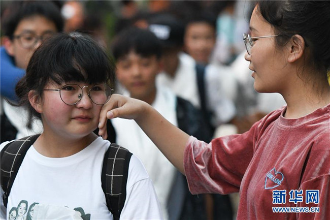 6月9日,合肥市第三十五中學(xué)西藏班的初三畢業(yè)生(右)與老師告別時落淚。