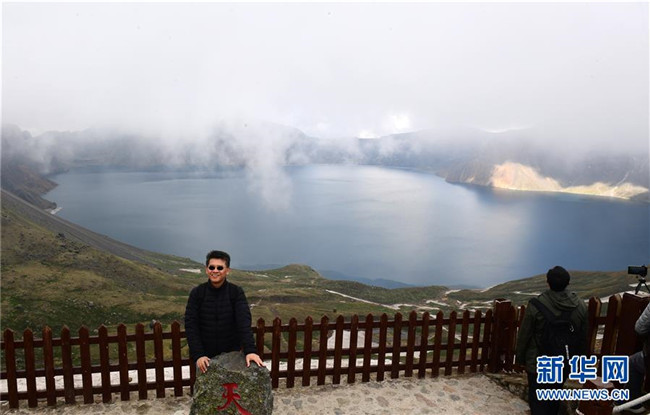 游客在長(zhǎng)白山天池游覽拍照(6月14日攝)。